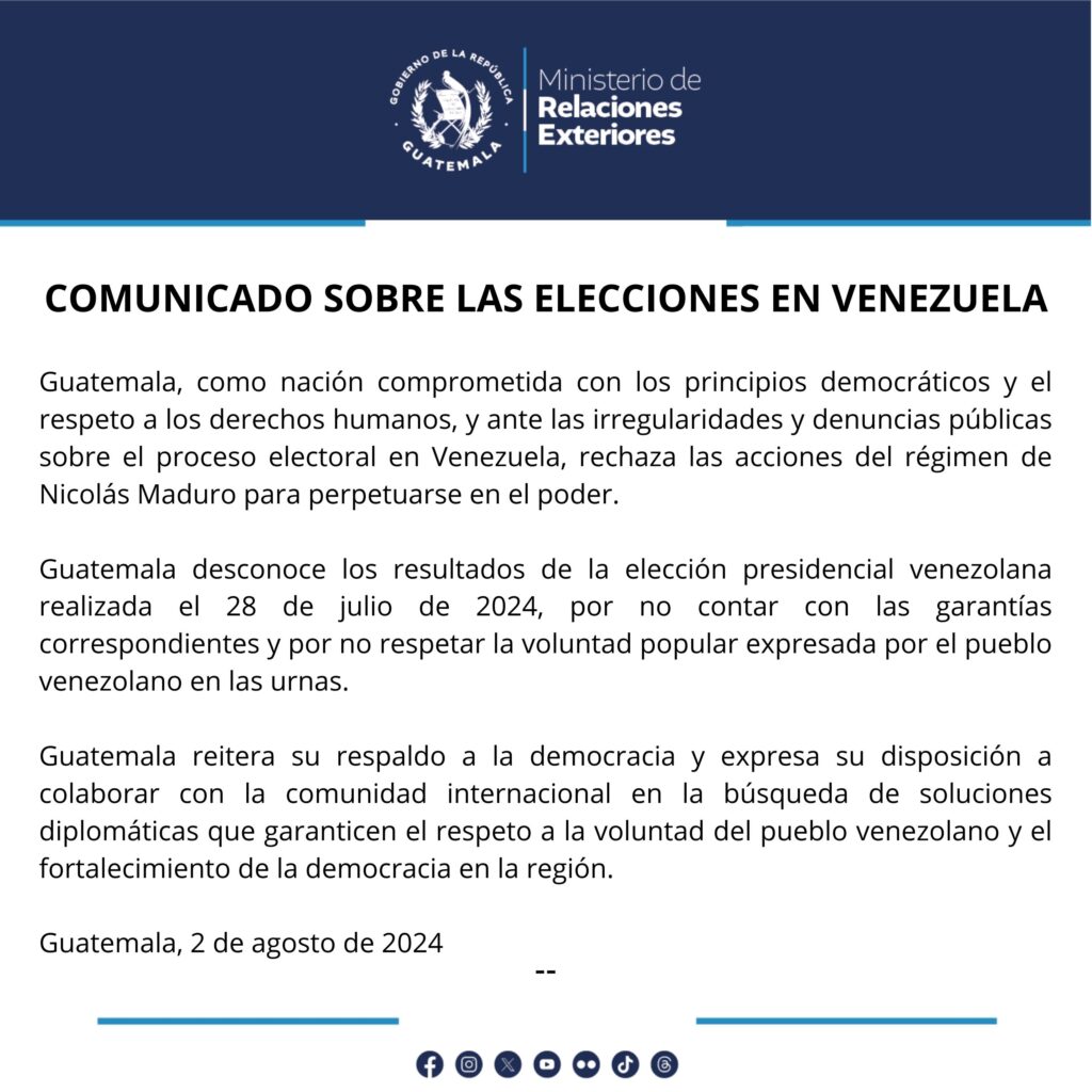El presidente Arévalo también condena la violencia que ha surgido en Venezuela tras las elecciones. «Nuestro Gobierno condena rotundamente la represión y violencia que ha desatado el Gobierno de Venezuela en contra de su propio pueblo, violencia que a la fecha ha dejado más de una decena de fallecidos», expresa Arévalo.