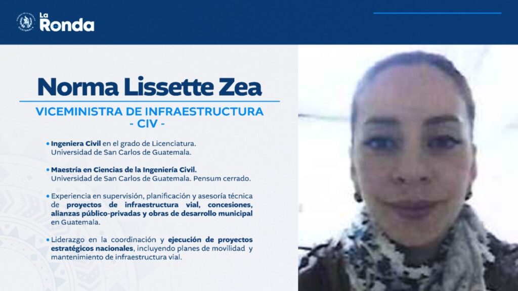 Por su parte, Norma Lissette Zea asumirá como viceministra de Infraestructura del CIV. Zea es ingeniera civil y posee una maestría en Ciencias de la Ingeniería Civil por la Universidad de San Carlos de Guatemala. Tiene amplia experiencia en supervisión, planificación y asesoría técnica de proyectos de infraestructura vial, concesiones, alianzas público-privadas y obras de desarrollo municipal. Además, ha liderado la coordinación y ejecución de proyectos estratégicos nacionales, incluyendo planes de movilidad y mantenimiento de infraestructura vial.