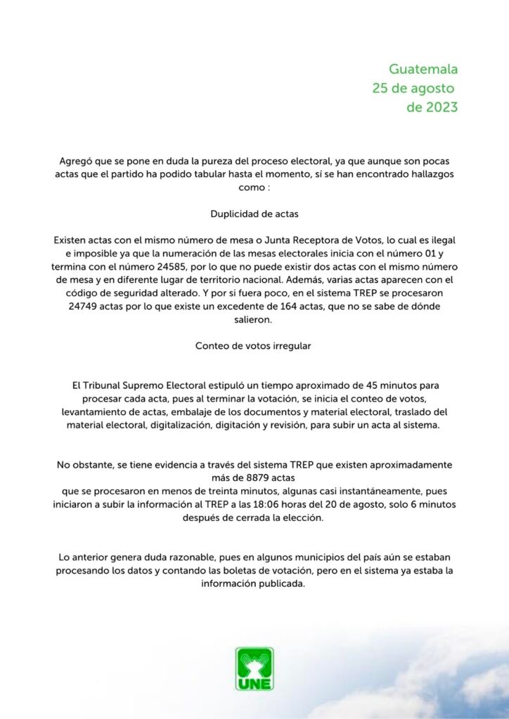 El abogado de la Unidad Nacional de la Esperanza (UNE), Carlos López Aquino, ha presentado una denuncia ante el Ministerio Público alegando un posible fraude electoral.