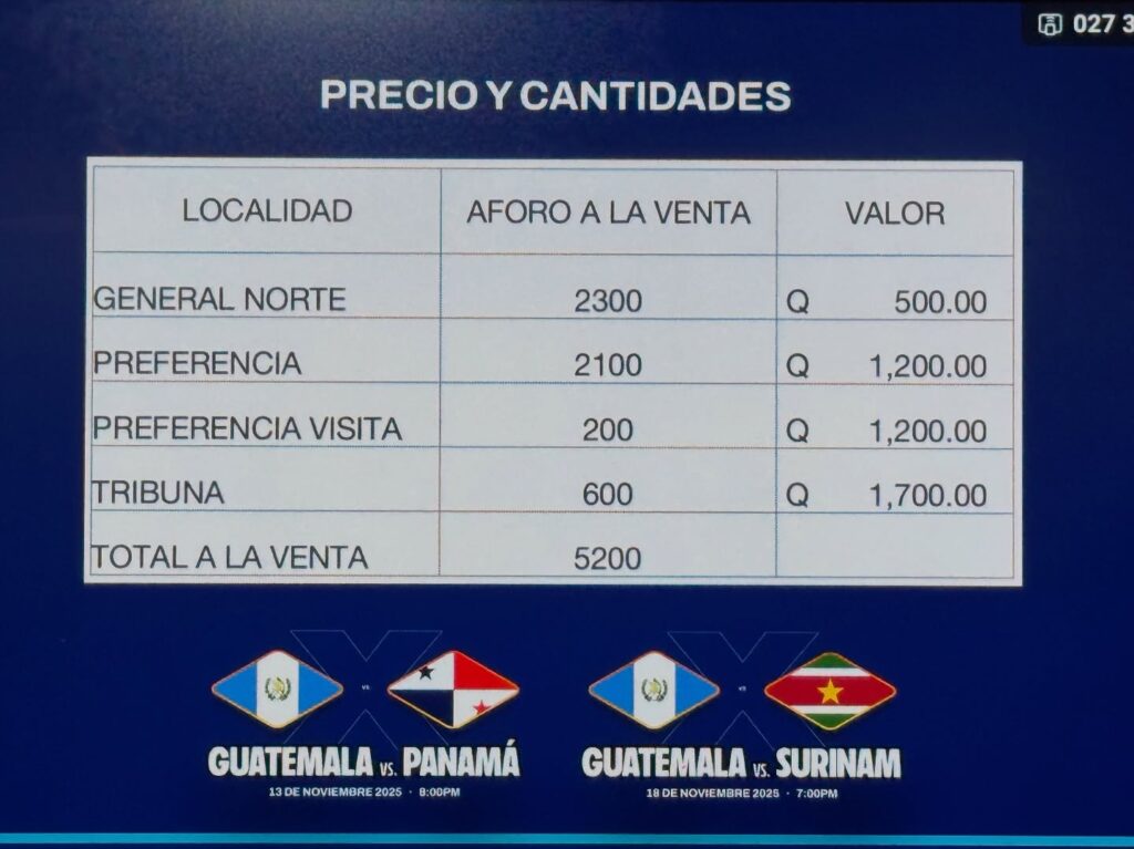 Los precios varían según la ubicación: General Norte tendrá un costo de Q500 con 2 mil 300 entradas disponibles; Preferencia y Preferencia Visita contarán con 2 mil 100 y 1 mil 200 boletos respectivamente, ambos con un precio de Q1 mil 200; mientras que Tribuna ofrecerá 600 entradas a Q1 mil 700 cada una.