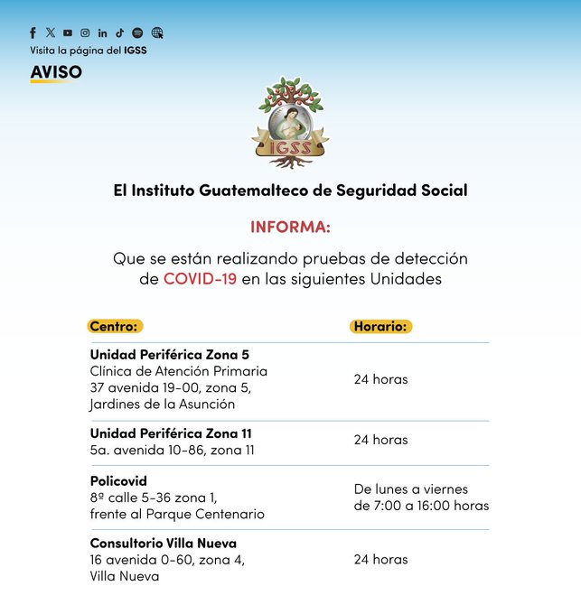Derivado de la situación, el Instituto Guatemalteco de Seguridad Social (IGSS) ha compartido los puntos en los que se practican las pruebas de detección de Covid-19. Las unidades y horarios son los siguientes: