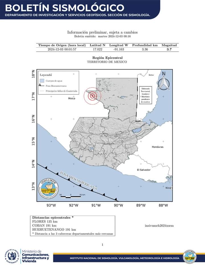 El segundo movimiento telúrico ocurrió ya iniciando el martes 3 de diciembre, con una magnitud de 3.7 y epicentro en territorio mexicano. Este sismo también fue sensible en varios departamentos de Guatemala, aunque de menor intensidad.