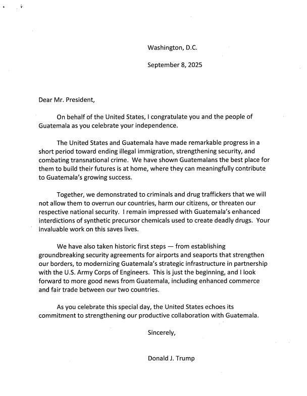 ENVÍA CARTA | Trump felicita a Guatemala por su Independencia