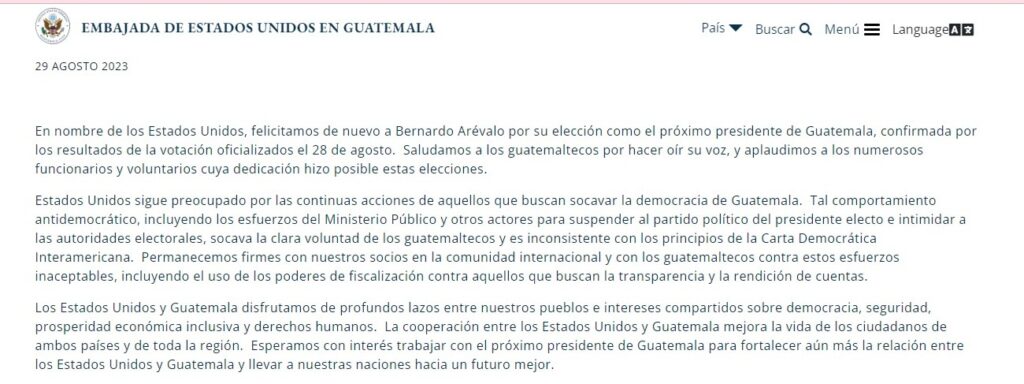 En un comunicado oficial emitido por la embajada de Estados Unidos en Guatemala, se reitera la felicitación a Bernardo Arévalo por su elección como el próximo presidente de Guatemala, confirmada por los resultados de la votación oficializados el 28 de agosto.