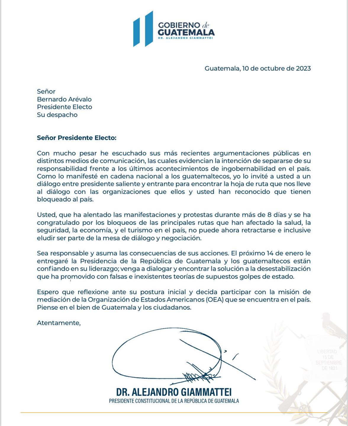 En sus declaraciones, Giammattei señala: «He recibido su mensaje y como lo dije en mis palabras a la nación del pasado lunes, como presidente saliente lo invito a un diálogo con el fin de encontrar la hoja de ruta que nos lleve a la conciliación.»