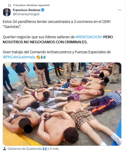 El control del Centro Especializado de Reinserción 1 (CER 1) fue restablecido este lunes tras la intervención de unidades élite de la Policía Nacional Civil (PNC), que liberaron a tres trabajadores retenidos como rehenes desde la madrugada por un grupo de pandilleros, según el gobierno de Guatemala.