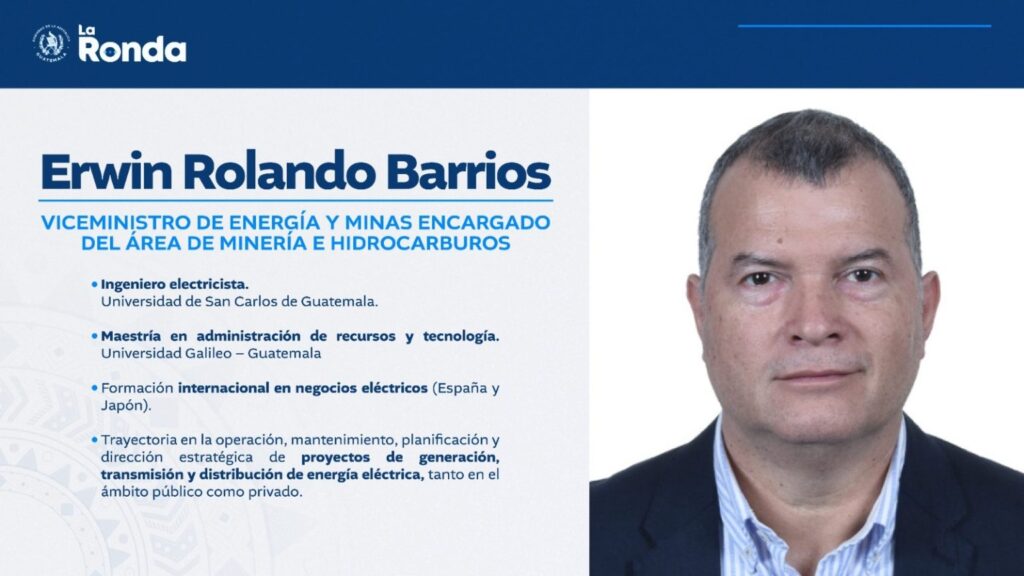 Erwin Rolando Barrios fue nombrado viceministro de Minería e Hidrocarburos del MEM. Es ingeniero electricista egresado de la Universidad de San Carlos de Guatemala, con una maestría en Administración de Recursos y Tecnología por la Universidad Galileo, además de formación internacional en negocios eléctricos en España y Japón. Barrios cuenta con experiencia en operación, mantenimiento, planificación y dirección estratégica de proyectos de generación, transmisión y distribución de energía eléctrica en los sectores público y privado.