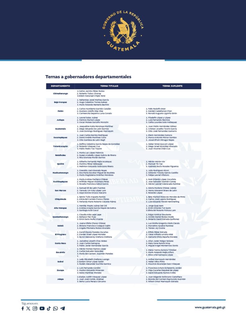El Gobierno de Guatemala, a través de la Secretaría General de la Presidencia, ha confirmado la recepción de las ternas de aspirantes a gobernadores departamentales, seleccionadas por los Consejos Departamentales de Desarrollo (Codedes) en todo el país.