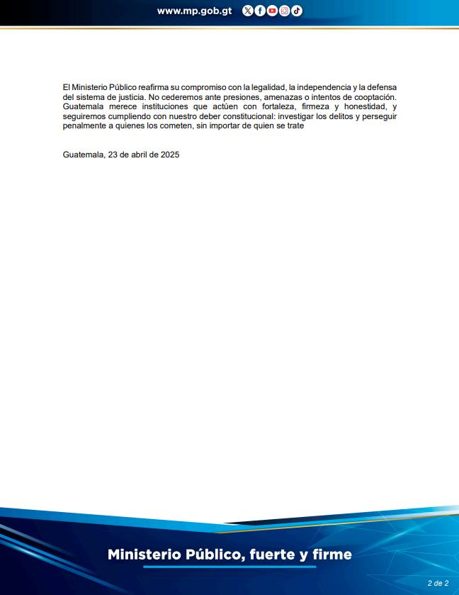 El Ministerio Público (MP) de Guatemala emite comunicado de prensa en respuesta a lo que describe como ataques infundados y recientes por parte del presidente de la República, Bernardo Arévalo.