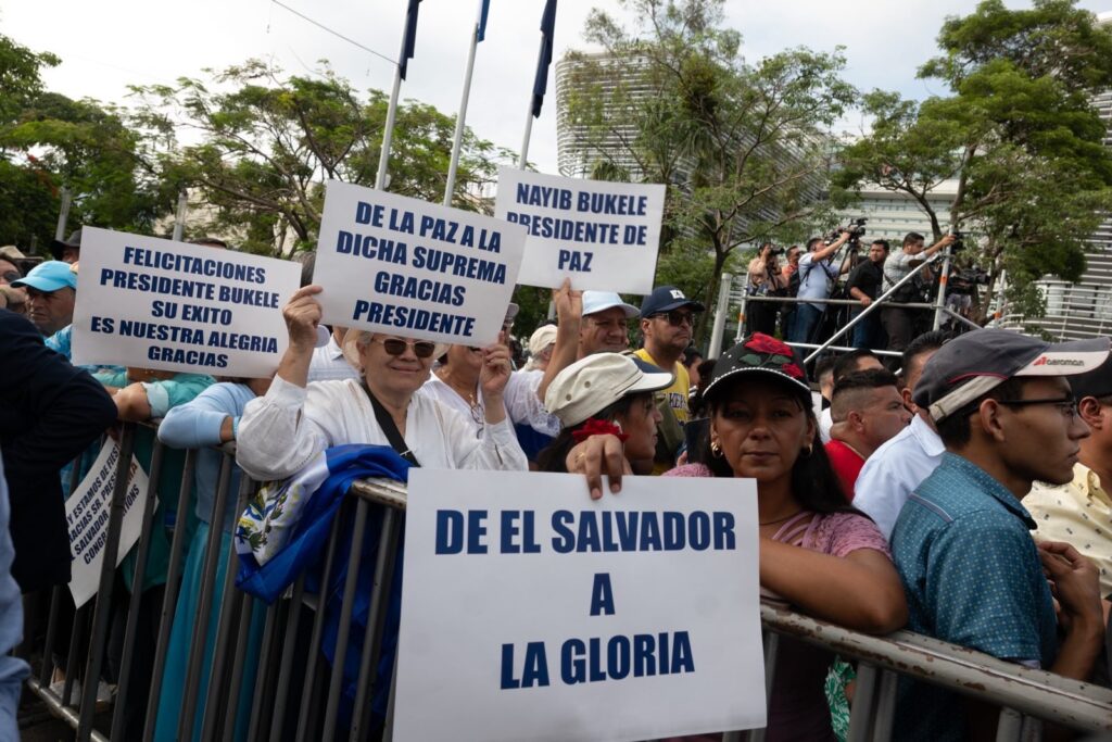 Miles de simpatizantes se congregaron en la plaza frente al palacio, coreando «¡Bukele, Bukele!» mientras disparos de salva resonaban en el aire. El presidente Bukele, quien ganó las elecciones con el 84.6% de los votos válidos, aunque solo un 43.4% del padrón electoral participó, agradeció el apoyo de sus seguidores.