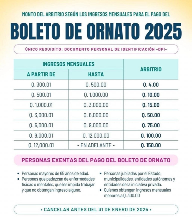 El boleto de ornato es una contribución obligatoria para todas las personas mayores de 18 años y menores de 65 años con capacidad de trabajo, de acuerdo con el Decreto 121-96.