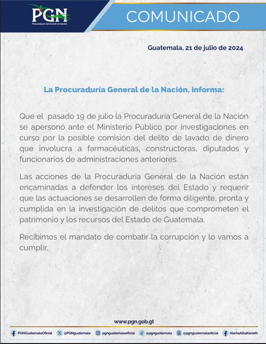 La Procuraduría General de la Nación (PGN) se apersonó ante el Ministerio Público (MP) el pasado viernes 19 de julio de 2024, en el marco de investigaciones en curso sobre la posible comisión del delito de lavado de dinero.