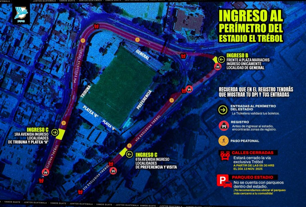 Asimismo, se informó que la vía exclusiva del Trébol permanecerá cerrada completamente desde las 9:30 de la mañana. Los parqueos oficiales estarán habilitados en Avenida Las Américas, Miraflores y Tikal Futura, ya que no habrá estacionamiento disponible en el recinto deportivo.