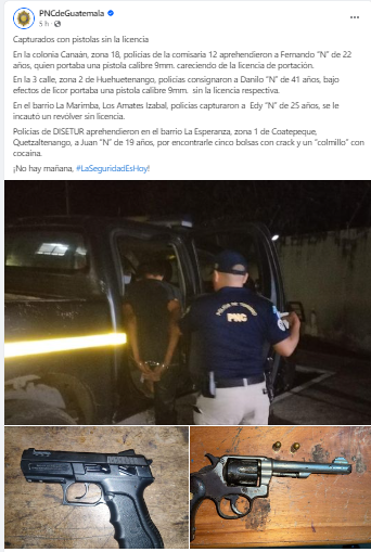 En una serie de operativos policiales llevados a cabo en distintas zonas de Guatemala, se ha logrado la captura de varios individuos que portaban armas de fuego ilegalmente. En la colonia Canaán, zona 18, agentes de la comisaría 12 detuvieron a Fernando “N” de 22 años, quien fue encontrado en posesión de una pistola calibre 9mm sin la licencia correspondiente.