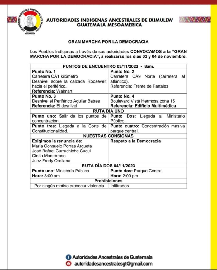 En medio de esta agitación política, Guatemala ha sido testigo de una serie de manifestaciones en el último mes. Para los días 3 y 4 de noviembre, se espera una marcha liderada por autoridades indígenas ancestrales de Iximulew, que recorrerá importantes puntos de la ciudad de Guatemala.